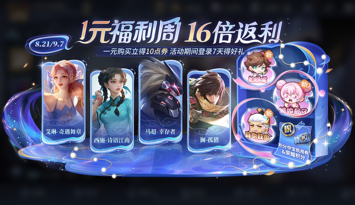 活動(dòng)簡介:在活動(dòng)內(nèi)1元購買10點(diǎn)券,登錄7天可領(lǐng)16倍返利,還可隨機(jī)獲得皮膚,全新個(gè)性表情或積分奪寶抵用券其中之一!