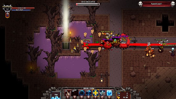 來到一個(gè)場景之后,每一個(gè)回合都有一定數(shù)量的怪物出現(xiàn)。我們需要控制角色不斷的在場景中擊敗怪物和破壞場景中的箱子來獲得獎(jiǎng)勵(lì),有時(shí)候我們會(huì)撿到裝備,有時(shí)候我們會(huì)撿到金幣。通過這樣不斷的戰(zhàn)斗獲得獎(jiǎng)勵(lì)讓自己的等級(jí)技能提升,獲得更好的裝備等等。如果本次戰(zhàn)斗你已經(jīng)比較滿意了,可以點(diǎn)擊屏幕下方四個(gè)按鈕中的第三個(gè),即回城魔法門回到城鎮(zhèn)中。