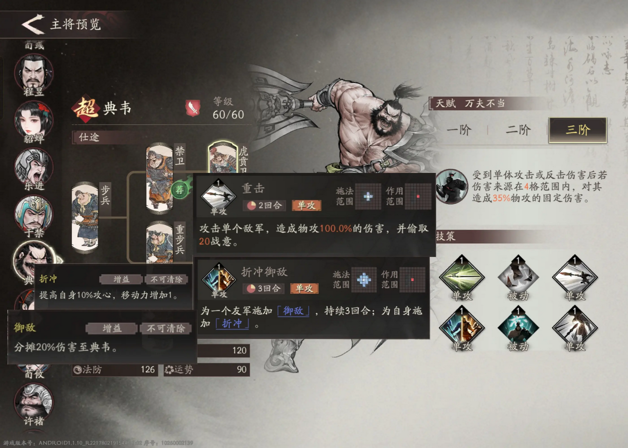 資源足夠的話,在前期可以把重步兵線也點開,折沖御敵這個技能在前期主將不全時功能性還是比較好的。前期推薦折沖御敵和重擊。在后期沒有輔助位或生存壓力大時推薦阻敵,古之惡來,背水一戰(zhàn)。而在生存壓力小或者有護盾類輔助幫忙控血時推薦古之惡來,阻敵和重擊。