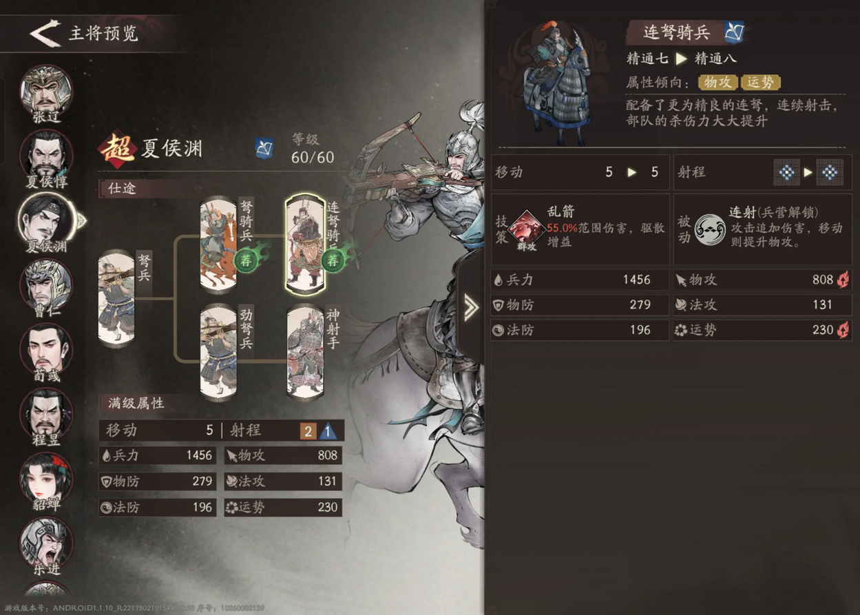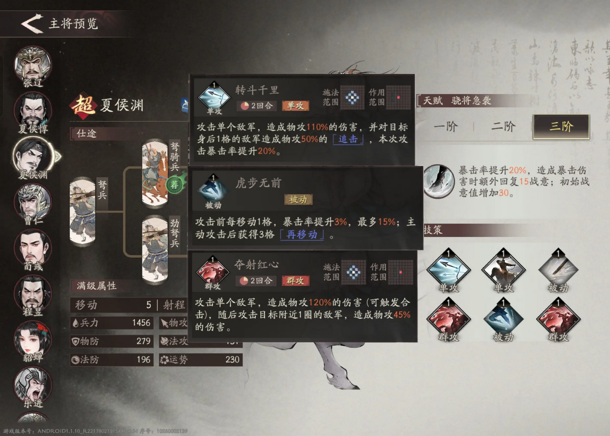 關(guān)于夏侯淵最著名的一句話是“典軍校尉夏侯淵,三日五百,六日一千。”在游戲里他的優(yōu)勢兵種也是騎兵。和夏侯惇正相反,注重單體爆發(fā)的夏侯淵不需要更大的攻擊范圍,攻擊范圍換為移動力對較脆的夏侯淵來說優(yōu)勢更大。