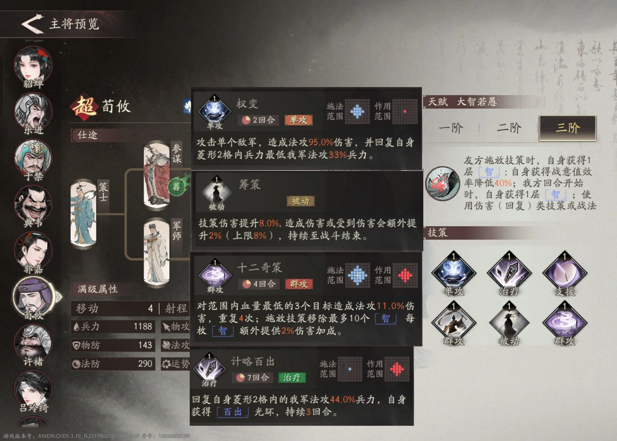 常規(guī)流:前期推薦權(quán)變和撫寧內(nèi)外。后期加上十二奇策作為爆發(fā)。放棄撫寧內(nèi)外的原因是都是減少技能CD類技能,綜合來說計略百出的群體增益對『智』的疊加更有幫助。如果隊友的技能cd大多不超過2回合,則可把計略百出換成籌策來追求更高輸出,帶權(quán)變的原因是普攻是無法消耗【智】的,必須帶有短CD的技能來保證輸出。