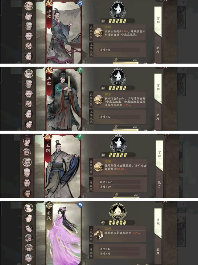 前期推薦杜氏作為過渡,一方面可以增加自身奶量,另一方面有對法攻基礎(chǔ)的加持。后期可視情況王朗,華歆,許攸等。