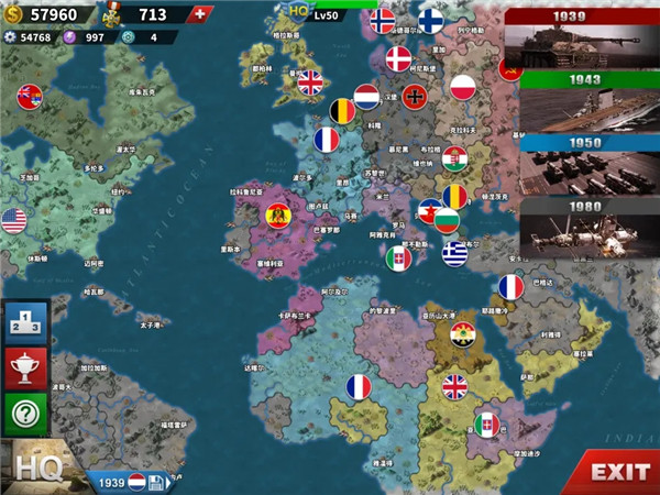 《世界征服者4》擁有獨(dú)特的年代系統(tǒng)功能鍵,位于界面右上角的年代選擇與國家分布嚴(yán)格對應(yīng)真實(shí)歷史背景,主要劃分為二戰(zhàn)前期、二戰(zhàn)后期、冷戰(zhàn)和現(xiàn)代戰(zhàn)爭四大時期。每個年代都設(shè)有符合史實(shí)的對立陣營:二戰(zhàn)時期為軸心國與同盟國,冷戰(zhàn)時期為華約與北約,現(xiàn)代戰(zhàn)爭則是聯(lián)合國對抗毒蝎恐怖組織(該陣營不可操控)。游戲難度會隨著年代推進(jìn)逐步提升,除1939年外,其他年代都需要通過完成對應(yīng)劇情戰(zhàn)役來解鎖——比如想體驗(yàn)1943年征服模式需先通關(guān)二戰(zhàn)歐洲劇本(任選陣營),1950年需通關(guān)二戰(zhàn)太平洋,1980年則需完成冷戰(zhàn)劇本。在HQ按鈕旁設(shè)有藍(lán)色進(jìn)度保存鍵,每個年代都有獨(dú)立存檔位,但重新選擇國家會清除當(dāng)前進(jìn)度。這里特別介紹高手必備的SL(存檔讀檔)技巧,通過合理運(yùn)用保存功能可以更高效地完成征服目標(biāo)。