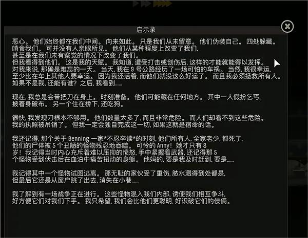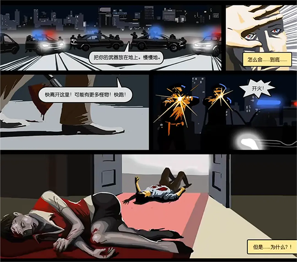 結(jié)局一:世界觀,首次進(jìn)入游戲會(huì)播放一段動(dòng)畫(huà),大意是歐美和東方(個(gè)人感覺(jué)就是亞洲)進(jìn)行戰(zhàn)爭(zhēng),但是東方投下了生化武器,大家都變異了,而外出的主角為了活著出去見(jiàn)到女兒必須從一百樓殺出去。