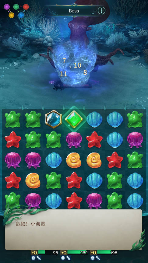 5、守關(guān)野生生物的血量條左側(cè)會(huì)顯示反擊回合數(shù),利用這個(gè)信息,你可以在敵人還未反擊時(shí)進(jìn)行有效的棋子消除。在空閑時(shí)間內(nèi)多消除棋子,能夠?yàn)槟愕暮l`積攢雙倍怒氣,為接下來的攻擊做好準(zhǔn)備。