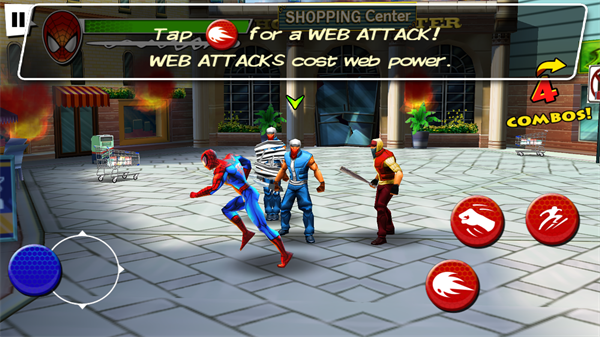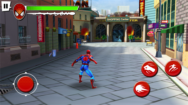 戰(zhàn)斗節(jié)奏緊湊,玩家可通過(guò)組合虛擬搖桿與按鍵實(shí)現(xiàn)快節(jié)奏連招。連擊系統(tǒng)鼓勵(lì)持續(xù)攻擊,積累積分可兌換蜘蛛戰(zhàn)衣或技能升級(jí),同時(shí)支持QTE(快速反應(yīng)事件)觸發(fā)華麗招式,提升操作爽快感。