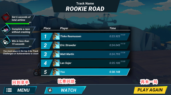 5、這里小編摔了個(gè)大跟頭,狗啃泥,得了個(gè)倒數(shù)第一。。這里可以看下剛剛的回放,或者快速再來一把!