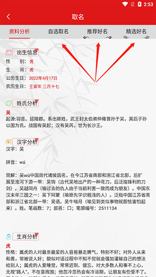 2、在查看資料的頁面可以在上方自選取名或者選擇系統(tǒng)推薦的好名等