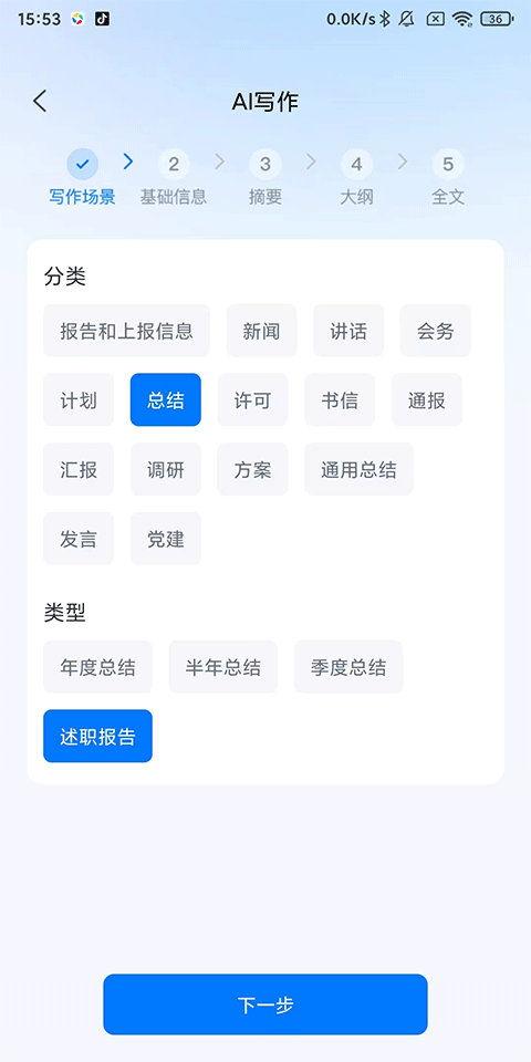 2、選擇寫作分類:報(bào)告、總結(jié)、 新聞 、講話等,類型:年度/季度/月度總結(jié)、述職報(bào)告等,點(diǎn)擊下一步;