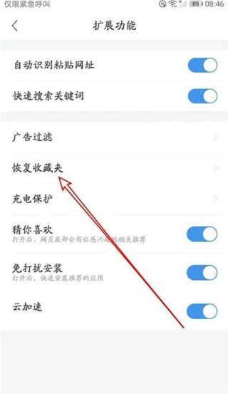 4、然后在打開(kāi)的擴(kuò)展功能頁(yè)面中點(diǎn)擊恢復(fù)收藏夾的設(shè)置菜單