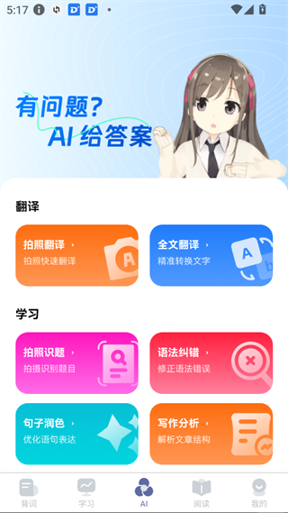 AI解答疑問,內(nèi)置翻譯、學(xué)習(xí)、練習(xí)等功能(如拍照翻譯、拍照識圖、語法糾錯)