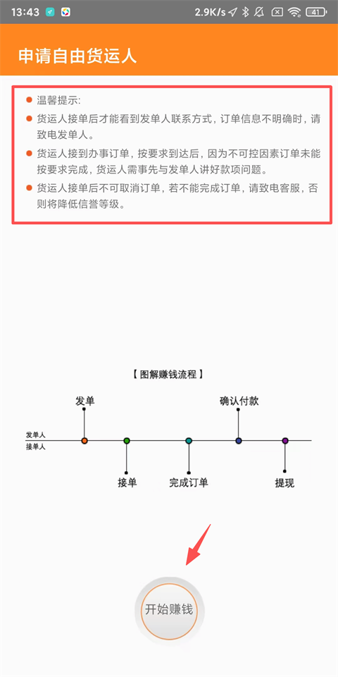 3、仔細(xì)閱讀申請自由貨運(yùn)人溫馨提示,隨后點(diǎn)擊開始賺錢;