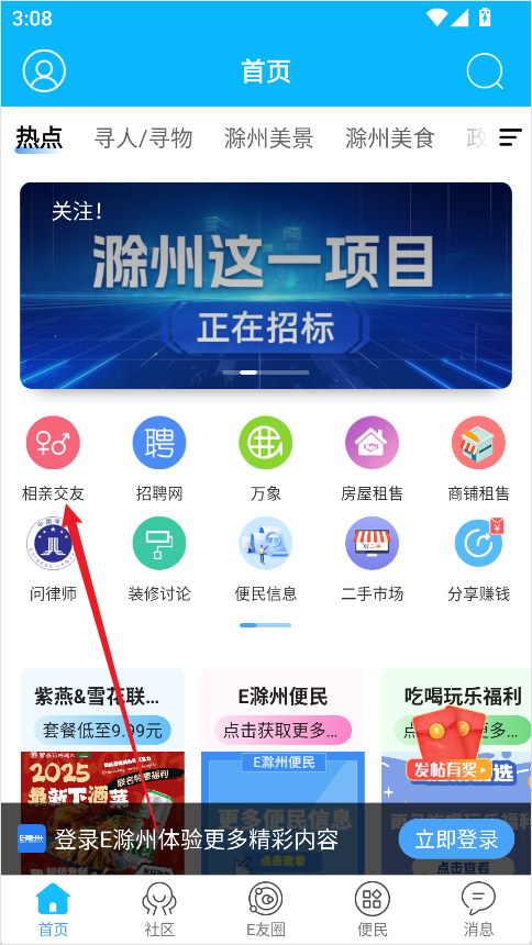 1、打開E滁州App后點(diǎn)擊首頁的「 相親 交友」模塊;